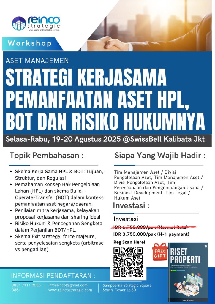 Event Information Price Rp3,750,000.00 per participant Location Swissbell Kalibata Jakarata Start Time 9:00 am August 19, 2025 Finish Time 4:00 pm August 20, 2025 Capacity Limited to 25 people Share: Previous Event Strategi Pengamanan Aset Properti Dengan Pendekatan Intelijen Next Event Tenant & Traffic In Mall: Pengelolaan Penyewa dan Strategi Bulksales Marketing Ritel Komersial