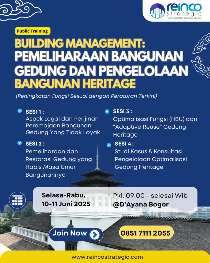 Pelatihan ini dirancang untuk memberikan pemahaman komprehensif terkait manajemen pemeliharaan bangunan, khususnya untuk bangunan gedung yang sudah tidak layak dan bangunan heritage. Peserta akan dibekali dengan aspek legal, teknis, dan strategi optimalisasi fungsi (HBU dan Adaptive Reuse) serta studi kasus pengelolaan gedung heritage yang sesuai dengan regulasi terkini.
