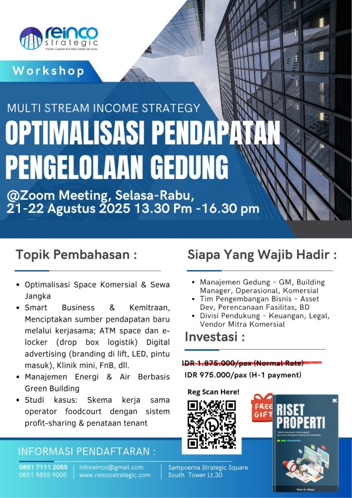 Event Information Price Rp975,000.00 per participant Location Zoom Meeting Start Time 1:30 pm August 21, 2025 Finish Time 4:30 pm August 22, 2025 Capacity Limited to 25 people Share: Previous Event Tenant & Traffic In Mall: Pengelolaan Penyewa dan Strategi Bulksales Marketing Ritel Komersial Next Event Smart City & Transport Management in Township
