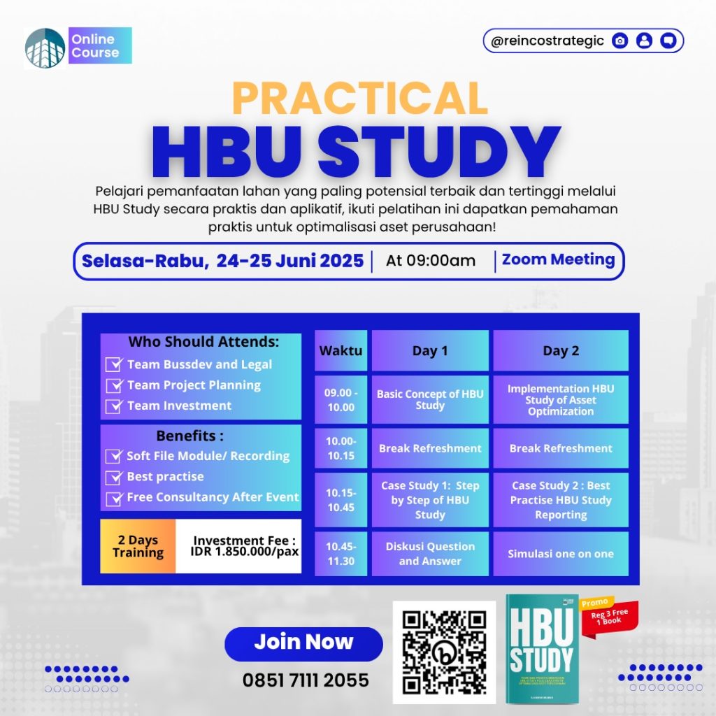Pelajari pemanfaatan lahan terbaik dan tertinggi (Highest and Best Use / HBU) secara praktis dan aplikatif untuk mendukung pengambilan keputusan dan optimalisasi aset properti perusahaan. Dapatkan metode analisis yang sistematis agar tim Anda mampu menyusun strategi berbasis potensi lahan secara objektif dan profesional.