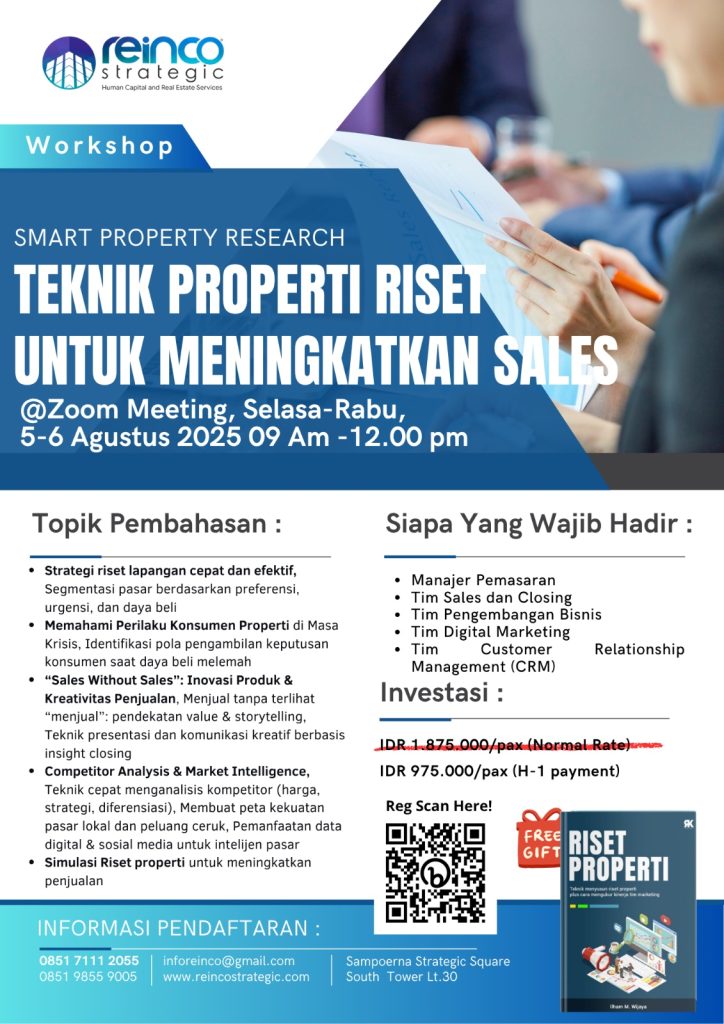 Event Information Price Rp975,000.00 per participant Location Zoom Meeting Start Time 9:00 am August 5, 2025 Finish Time 12:00 pm August 6, 2025 Capacity Limited to 25 people Share: Previous Event HBU Study Masterclass : Strategi Peningkatan Nilai Lahan Dengan HBU Next Event Feasibility Mastery: Studi Kelayakan Proyek Ritel Komersial yang Tepat Sasaran